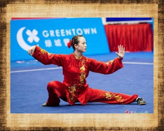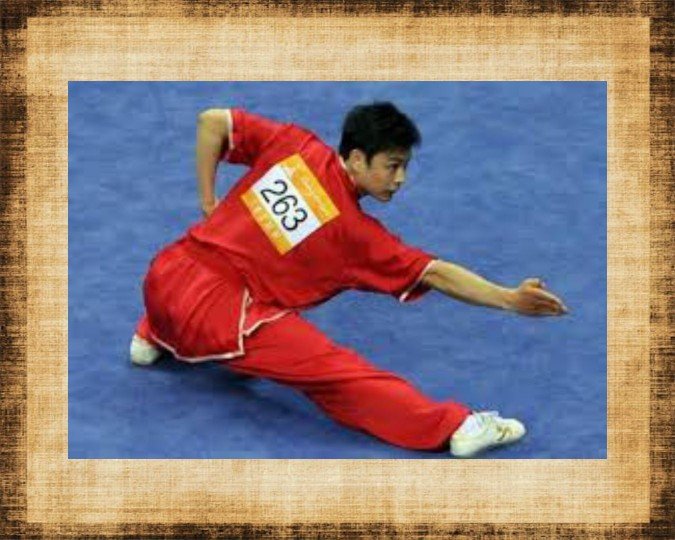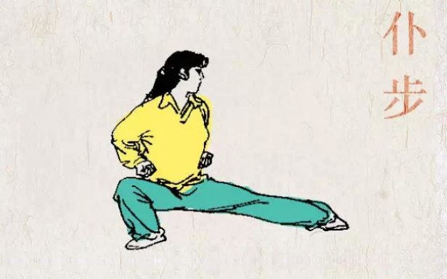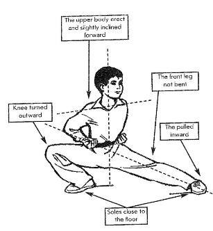 Это очень распространенная поза во многих стилях ушу. Его можно использовать для уклонения от атаки путем понижения центра тяжести или для уменьшения расстояния до противника на один шаг. Задняя нога полностью согнута и вся подошва находится на полу. Передняя нога выпрямлена, подошва полностью стоит на полу, а кончик повернут внутрь. Корпус немного наклонен вперед.