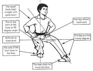 - Передняя нога слегка согнута в колене, касается пола только носком, колено немного повернуто вовнутрь.