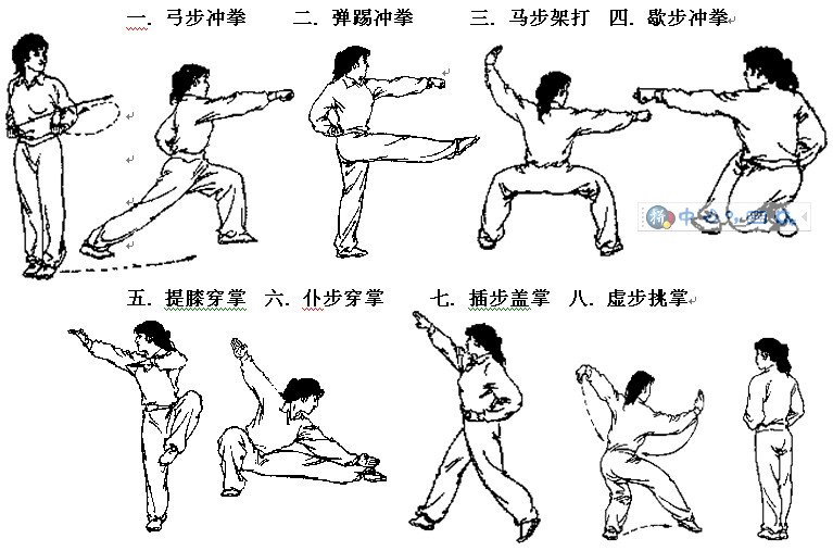 После того, как вы изучите основные шаги, технику рук и ног, вы сможете выполнять следующие основные комплексы. Как только вы освоите их, вы сможете выполнять более длинные и сложные формы.